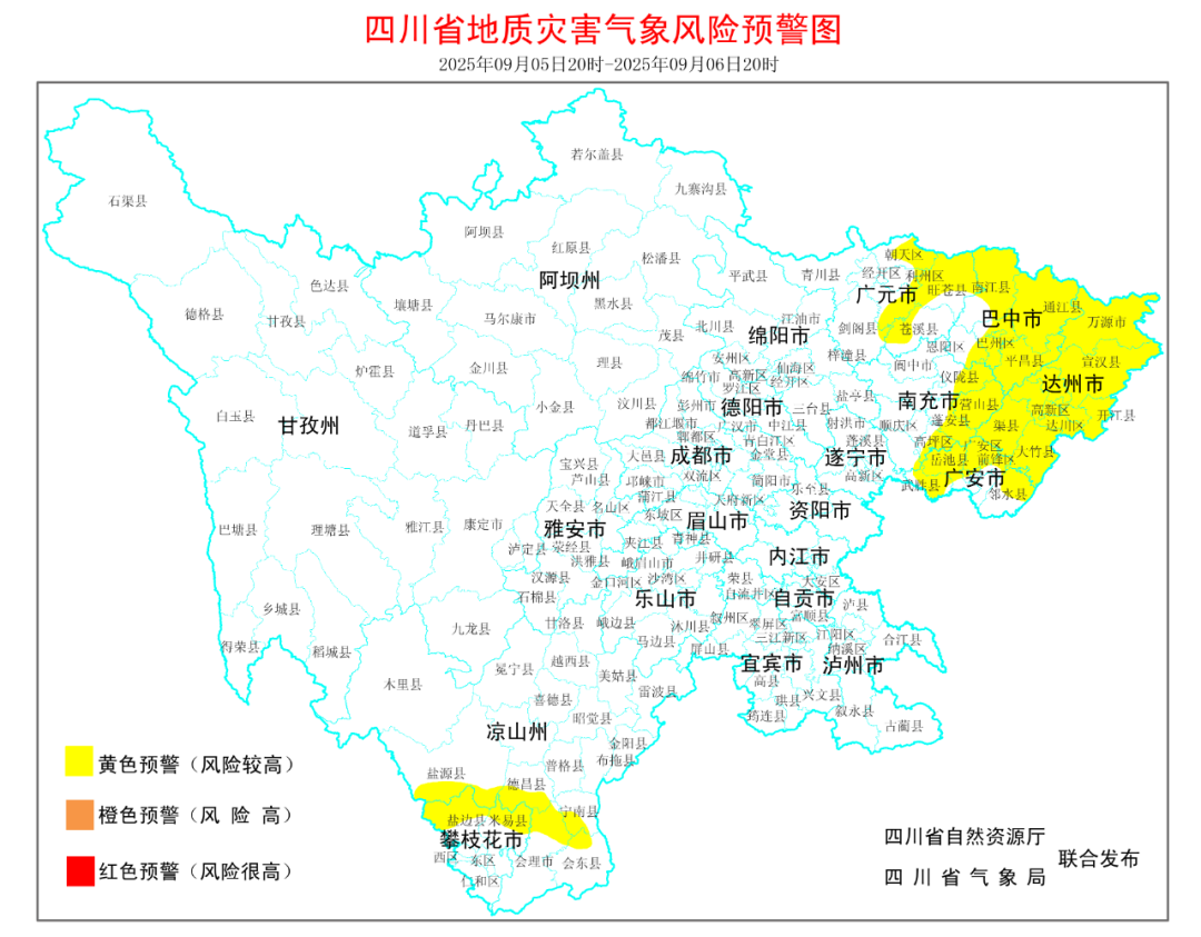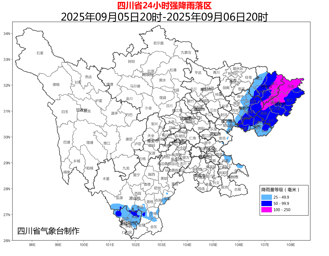 9月5日20时到6日20时:达州、巴中、南充、广安4市有暴雨(雨量60~90毫米),局部大暴雨(雨量170~220毫米),最大小时雨强50~80毫米,并伴有短时雷雨大风;另外,攀西地区南部的部分地方有大雨到暴雨(雨量30~80毫米)。